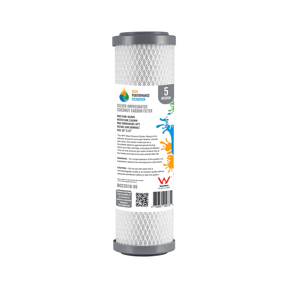 5 Micron - Coconut Carbon Block Water Filter - Silver Impregnated (Bacteriostatic) - 10" x 2.5"