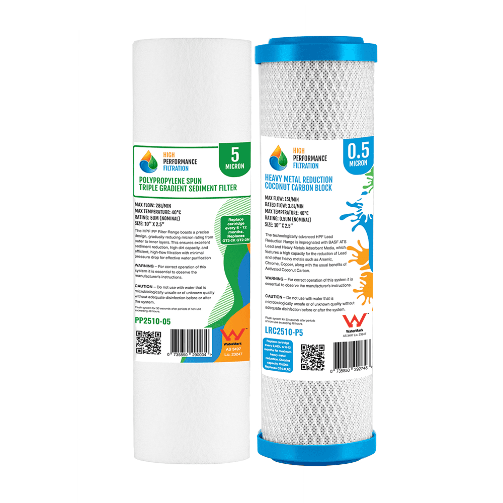 Includes one 5-micron polyspun sediment filter and one 0.5-micron heavy metal-reducing carbon block for comprehensive water purification.